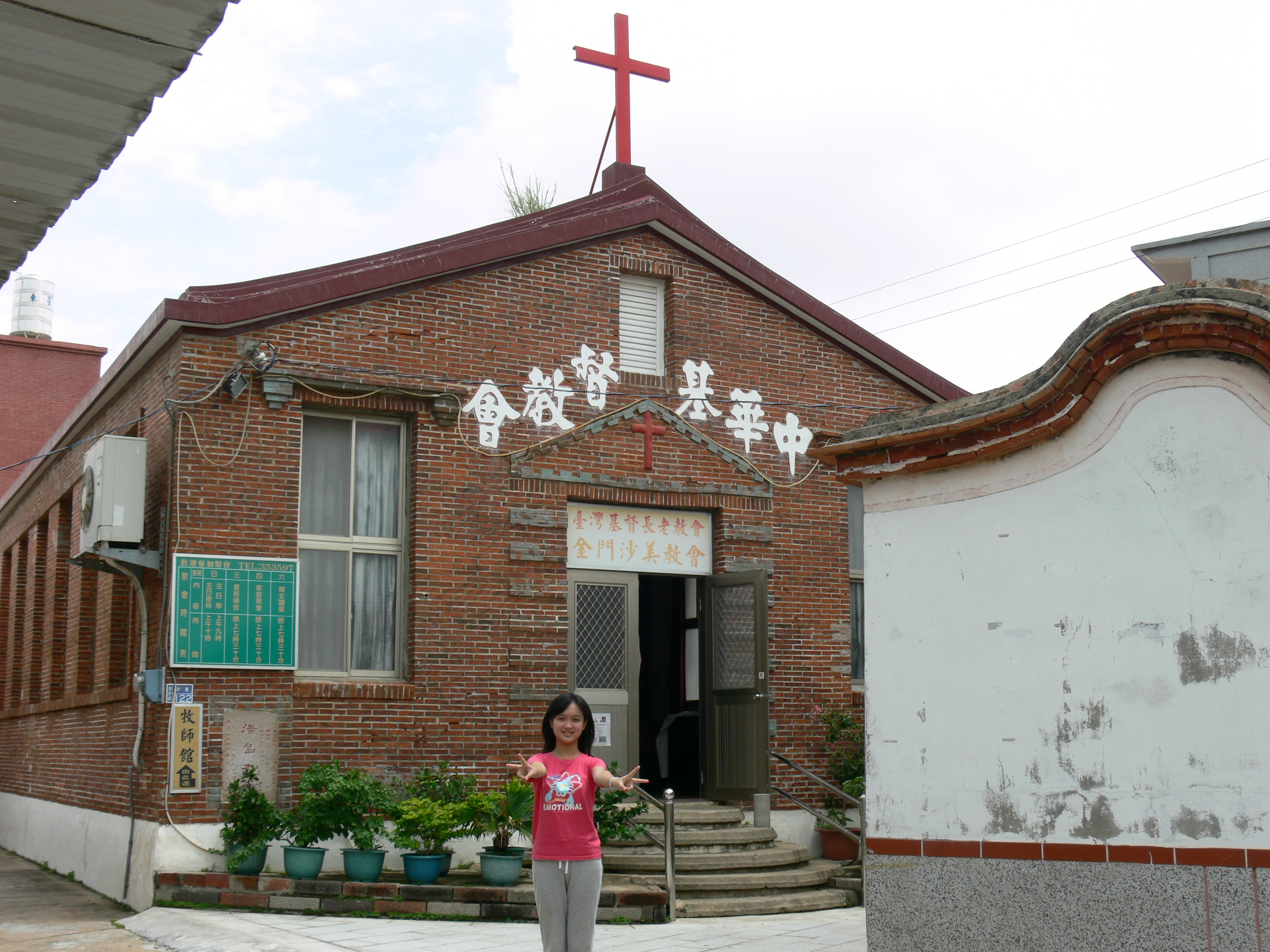 6/24~26我們全家到金門玩,6/26拜訪了沙美教會。為什麼標題叫"獅群中的十字架"呢?因為金門有80幾隻的"風獅爺". 教會只有6間.所以相較於風獅爺.十字架真的是非常少!沙美教會的王中武傳道在沙美教會已經3年了。他還很熱心的用投影片為我們介紹。以下是我從王傳道聽來的故事:沙美教會設立於1895年,於1945~1947年重建<因為常有戰爭,所以教會曾經被炸毀過>於1998年加入長老會<所以建築上才印有"中華基督教會">金門5萬人,共有6教會,只有一間基督長老教會,基督徒只有200人,只佔千分之4!王傳道3年前剛到沙美教會時,只有21人<其中坐在第一牌的6個阿媽年齡和大約500歲>但3年來王傳到辦了品格才藝營<有陶笛班.英文班.美食班等>還有快樂兒童營.插花...課程。藉由這些活動.讓大家慢慢接近基督教。現在沙美教會已經有65人囉!!這些在台北地區看似簡單常見的營隊,其實辦起來是相當不容易的!因為經費的不足,還要到處借場地,請金門科技大學的學生.教授來幫忙。沙美教會還得到"內政部全國績優宗教團體社會教化獎"喔!!真的是不簡單!!王傳道說:神給你多少,你就要為別人奉獻多少!在小鄉下的沙美教會都能傳福音給這麼多人了,擁有更多資源的我們,是不是也該更努力呢?!因為王傳道熱心的講解.我也認真的抄筆記,所以這次到了沙美教會真是學到了不少喔! |