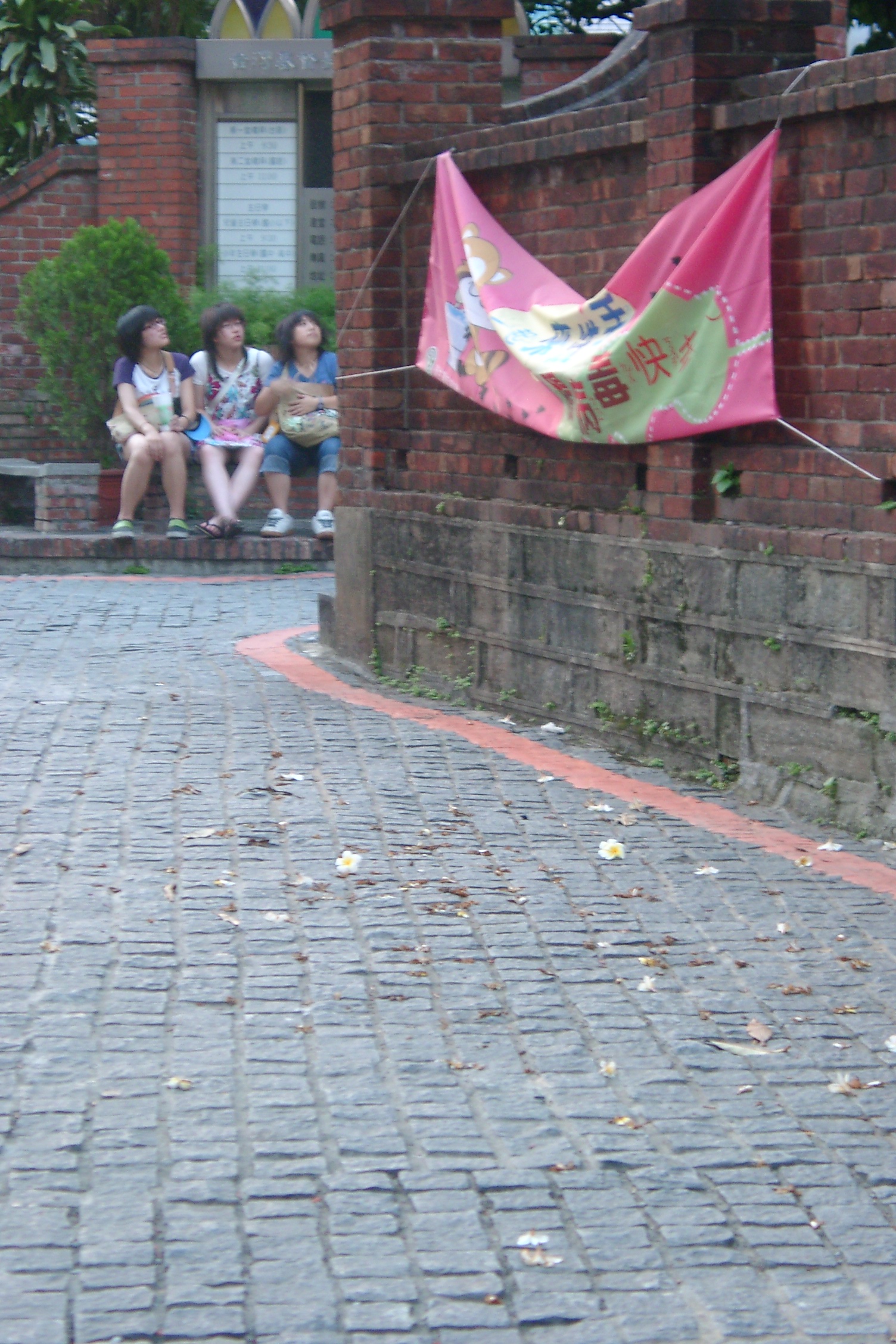 有三個女孩走進教會圍牆,繞了一圈後出來,坐在教會告示牌前的紅磚椅上。她們嘻嘻哈哈的拿著相機自拍,左一下、右一下,玩了一會後停了下來,望望四周,最後同時盯著教會發呆。